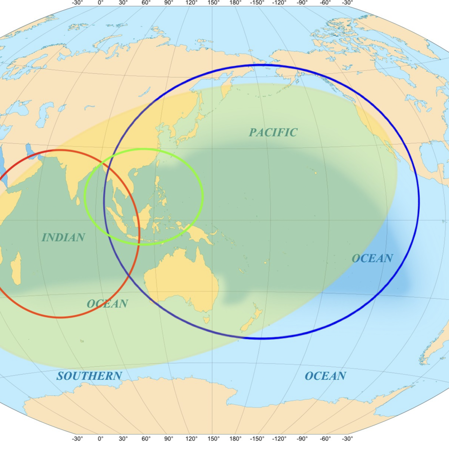Red circle/oval roughly depicts the Indian Ocean region. Blue circle/oval covers the Pacific region. Green oval covers ASEAN. Yellow overlay covers the Indo Pacific.