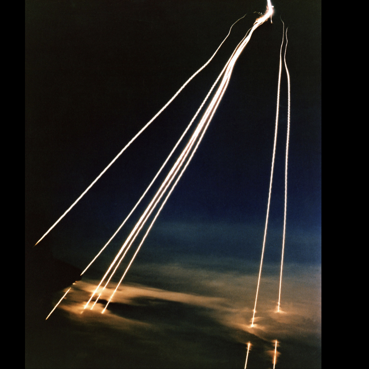 Photo: A time exposure of seven MIRVs from Peacekeeper missile passing through clouds